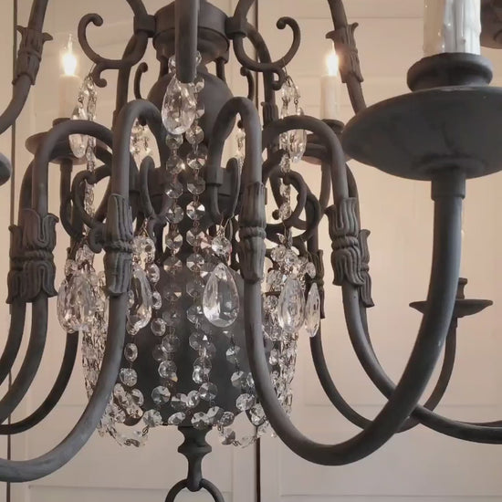 Heavy, vintage, brass chandelier showing off her beautiful details in our handpainted "Black Zinc" patina and adorned in crystals... 15-lights!
